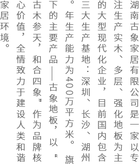 古象地板是湖南古象家居有限公司旗下的品牌,是專注于生產(chǎn)實(shí)木、多層、強(qiáng)化地板的木地板廠家,目前國(guó)內(nèi)包含三大生產(chǎn)基地:深圳、長(zhǎng)沙、湖州。年生產(chǎn)能力為400萬(wàn)平方米。品牌成立多年以來(lái),以強(qiáng)大的實(shí)力和盡善盡美的產(chǎn)品以及誠(chéng)信經(jīng)營(yíng)獲得廣大用戶和合作伙伴滿意和信任,古象地板已經(jīng)廣泛應(yīng)用于國(guó)內(nèi)各大城市的樓盤、酒店、公共區(qū)域。